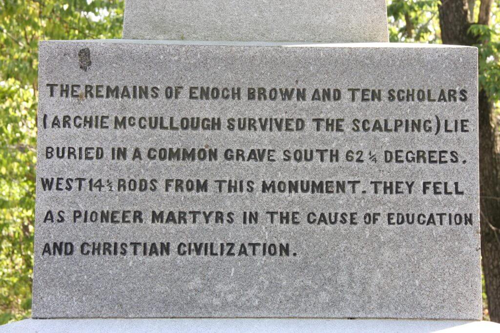4 Lenape American Indian entered the schoolhouse (near present-day Greencastle, Pennsylvania), shot and killed schoolmaster Enoch Brown, killed 9-10 children (varying reports) and only two children survived the massacre.